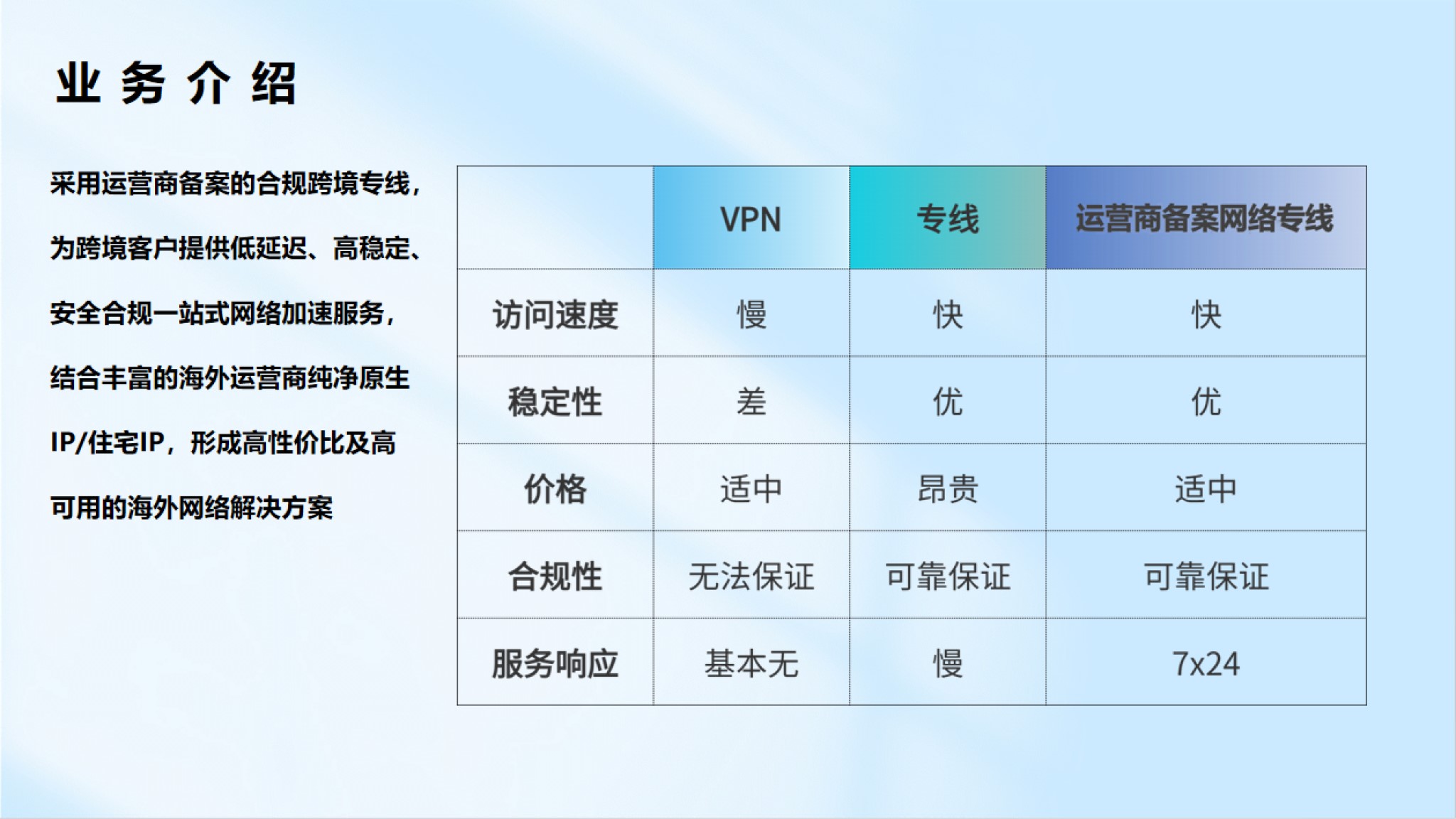 遵從運營商規(guī)則,采用運營商備案網(wǎng)絡(luò)專線,結(jié)合海外運營商純凈獨享原生IP,提供低延遲、高穩(wěn)定、安全合規(guī)的海外網(wǎng)絡(luò)服務